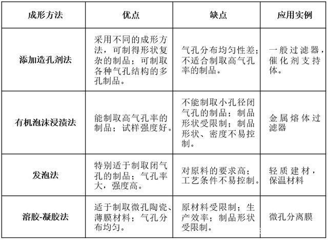 表1 制取多孔陶瓷材料的多种工艺的比较