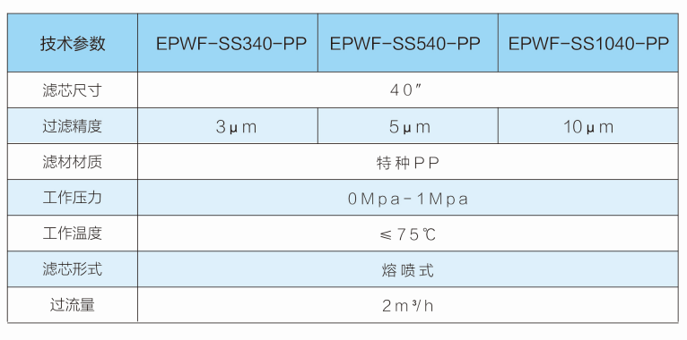 EPWF-SS系列滤芯优势 ※热熔一体成型,孔径致密均匀,无粘合剂添加,无溶出物。 ※高精度,更强耐压性能。 ※梯度过滤,更大纳污空间,更长寿命。 ※反洗效率高,操作简单。 ※耐酸碱。 EPWF-SS系列滤芯应用 ※反渗透系统保安过滤。 ※油漆、涂料、石油化工以及电子工业。 ※生物制药行业原材料、溶液、水的过滤。 ※电镀溶液过滤。